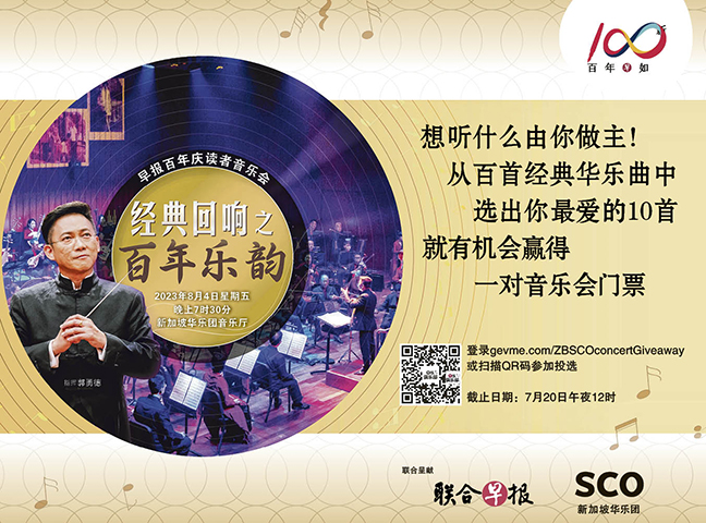 即日起,早报会员只须进入抽奖活动页面,投选您最喜爱的10首华乐曲,并提交个人信息,就有机会赢取一对联合早报和新加坡华乐团主办的 “经典回响之百年乐韵” 早报百年庆读者音乐会门票。