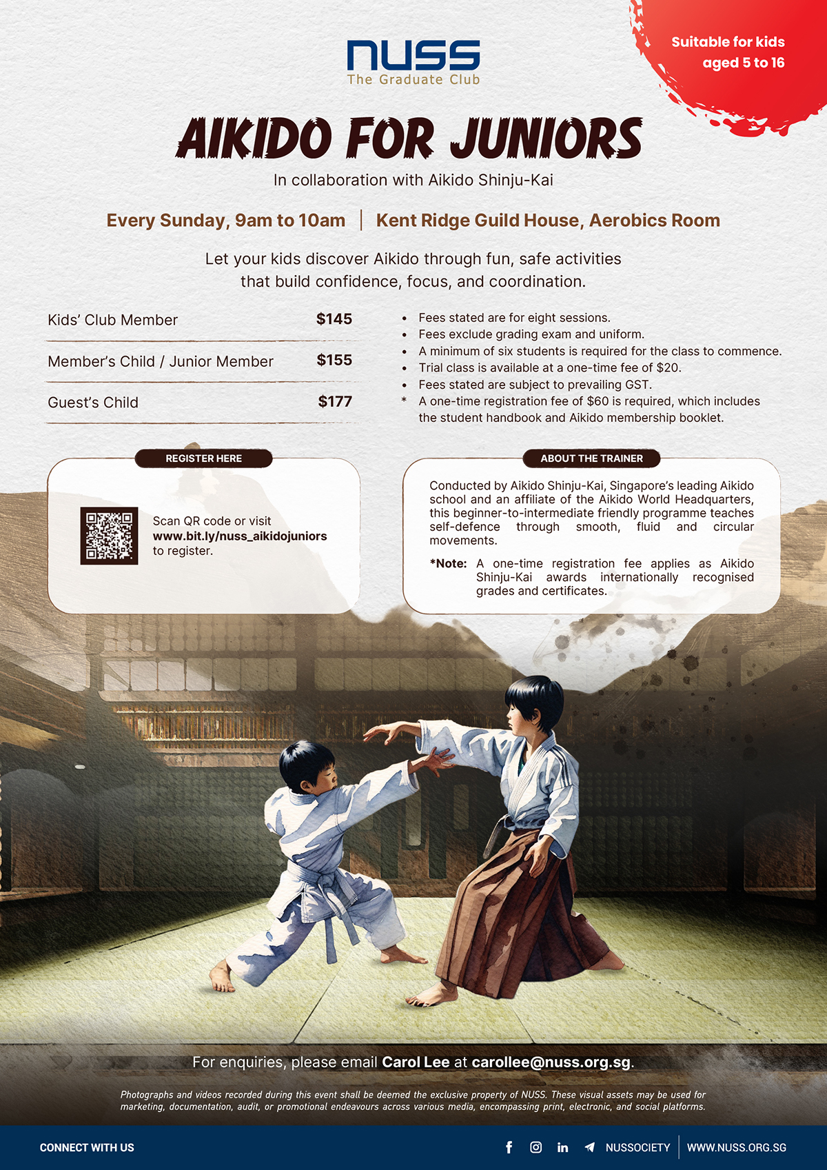 - A one-time registration fee of $60 (subject to prevailing GST) is required, which includes student handbook and Aikido membership booklet.