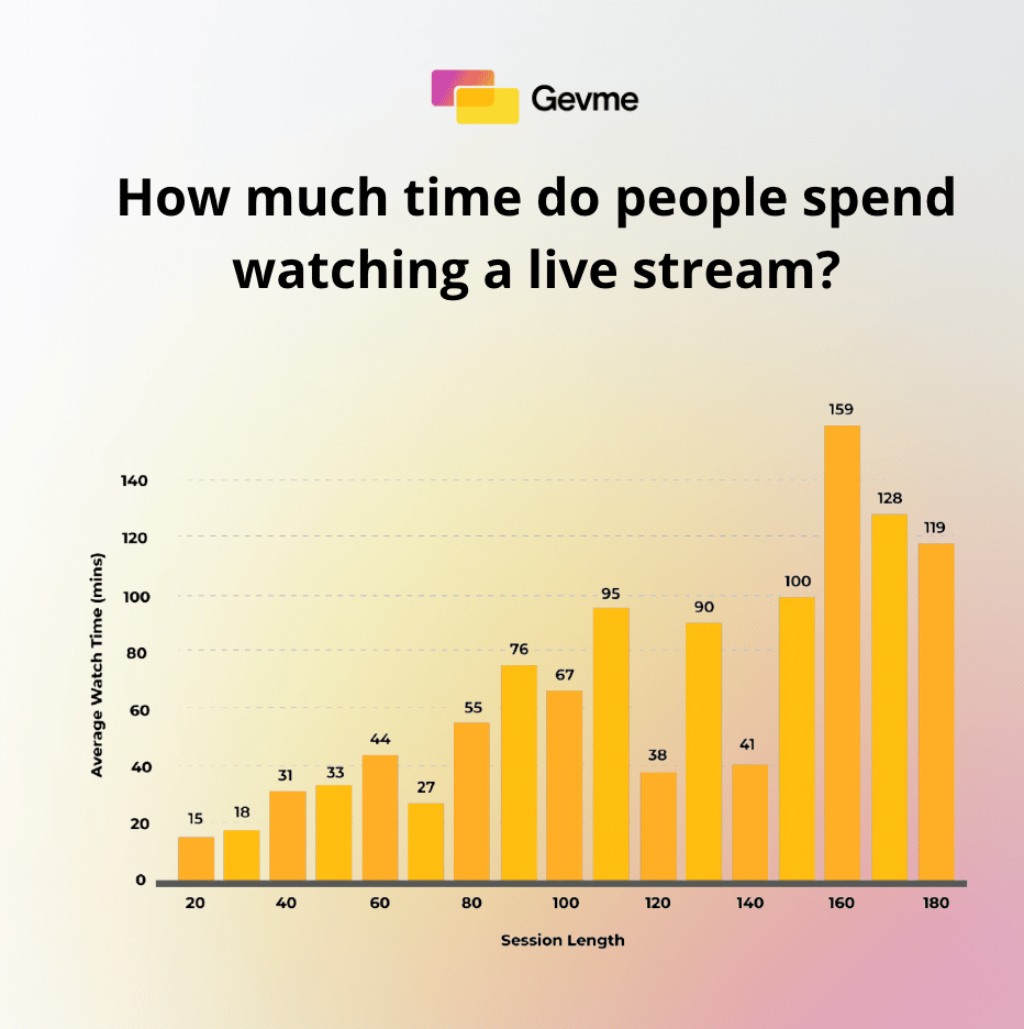 Our data indicate that the average watch time for a live session of 100 minutes (1 hour 40 minutes) is 67 minutes (1 hour 7 minutes). A live session of 150 minutes (2 hours and 30 minutes) is likely to garner an average watch time of 100 minutes (1 hour 40 minutes).