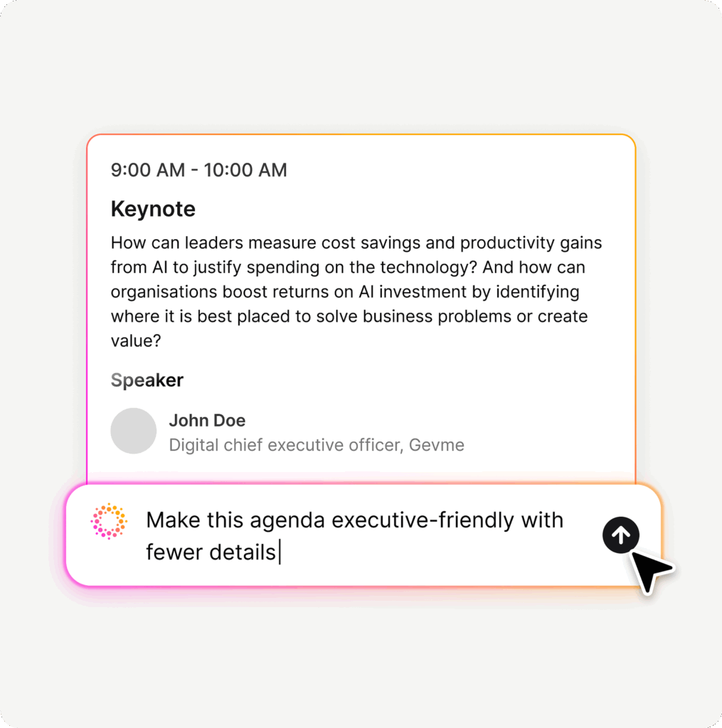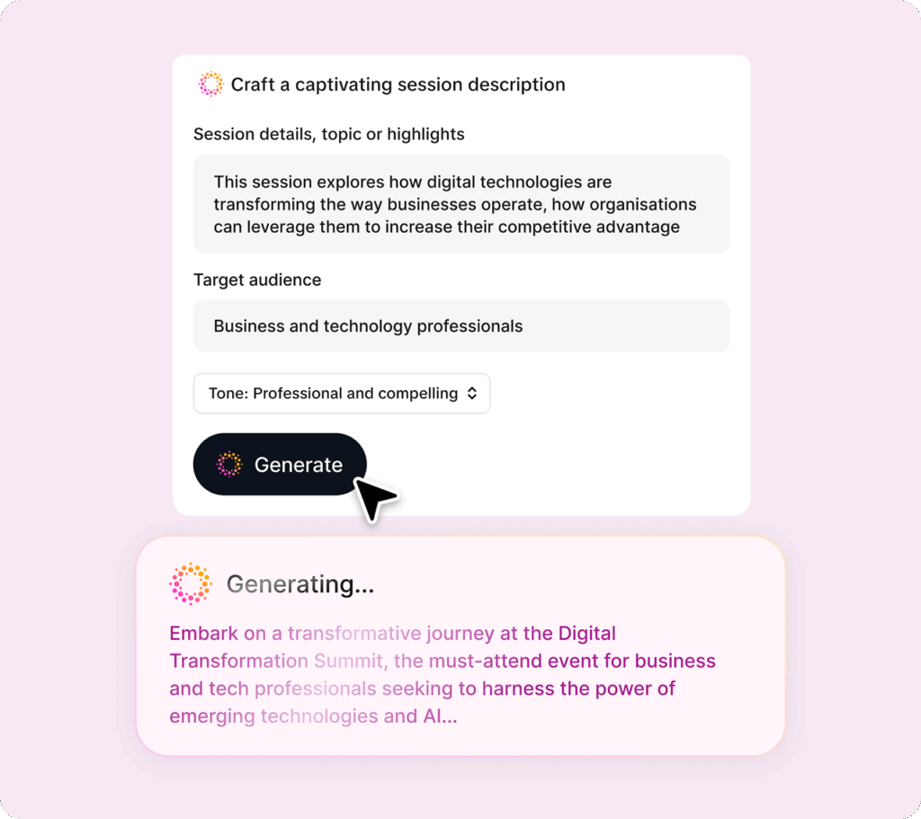 Quickly craft agendas, session blurbs, speaker bios, and event copy that fit your style and audience.