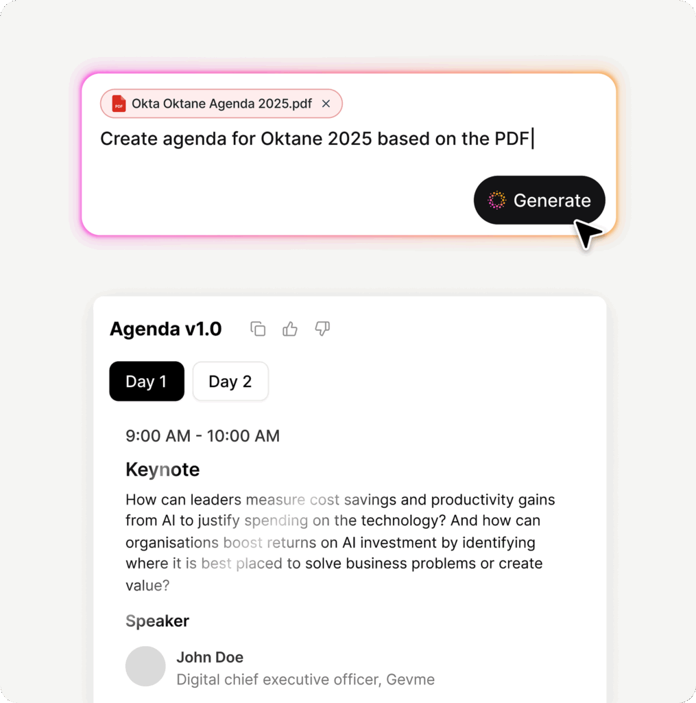 Turn your ideas or existing content into a full agenda, ready to review and publish in Gevme.