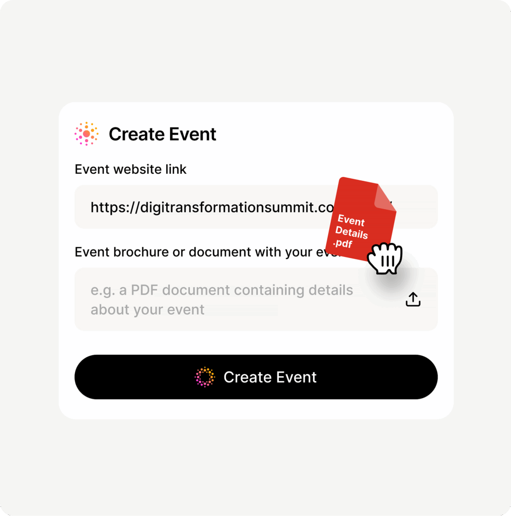Coplanner auto-extracts event details – name, dates, venue, topics – maps them into Gevme modules, and gets everything ready to launch in one click.