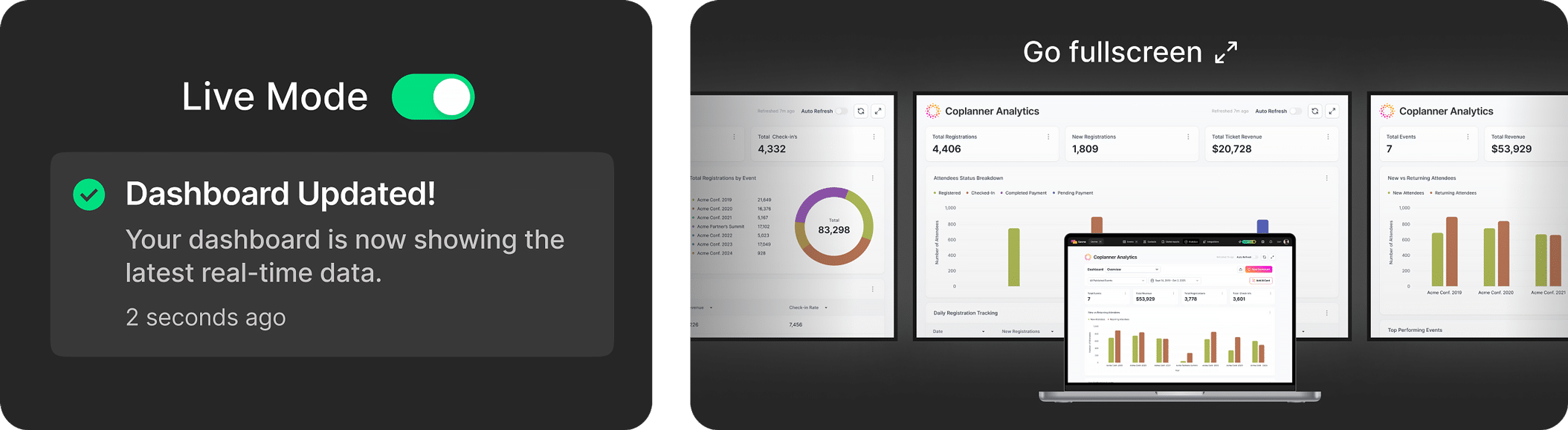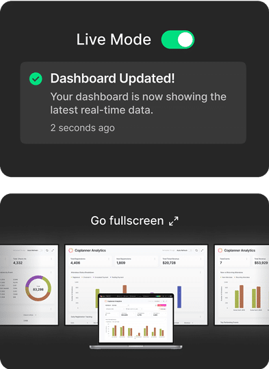 Live dashboards that show real-time registrations, payments, attendance, and engagement; fullscreen monitoring keeps teams aligned, sharing accurate insights without regenerating reports.