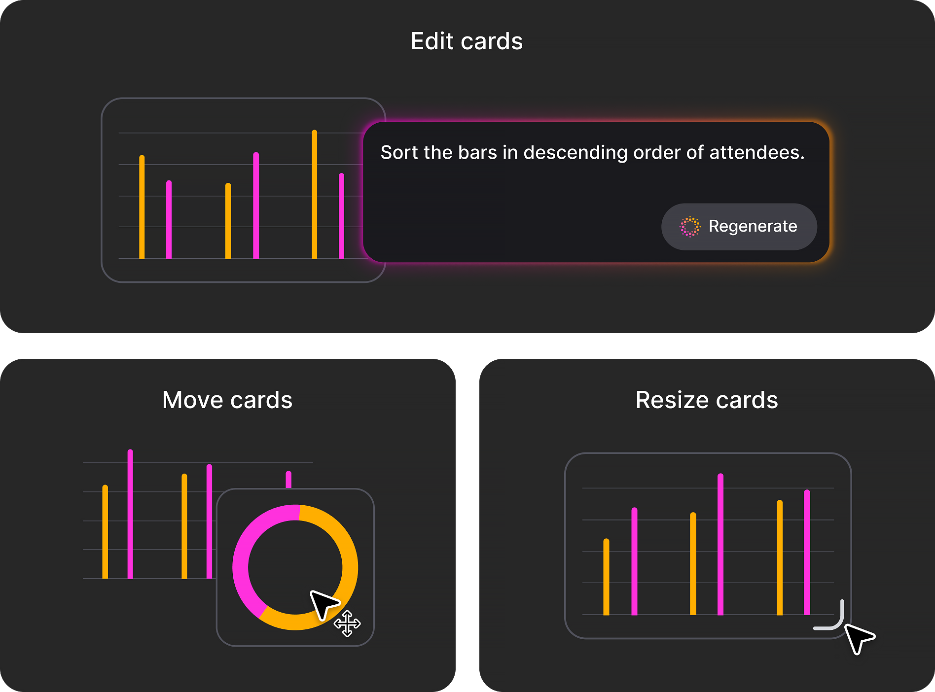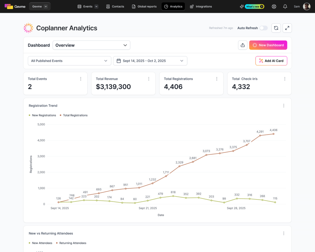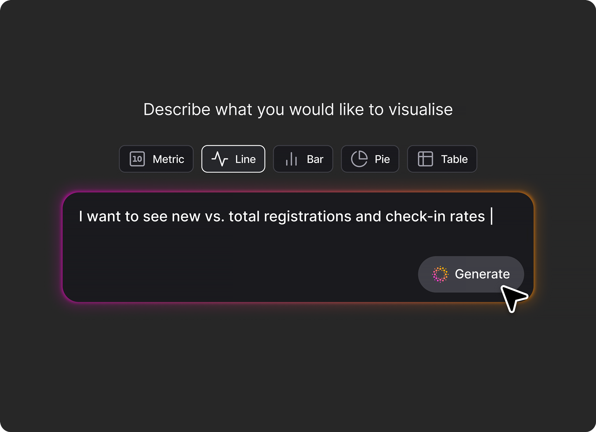 Ask in natural language: “Show me ticket sales by type and revenue collected.” Coplanner translates it into full dashboards in seconds.