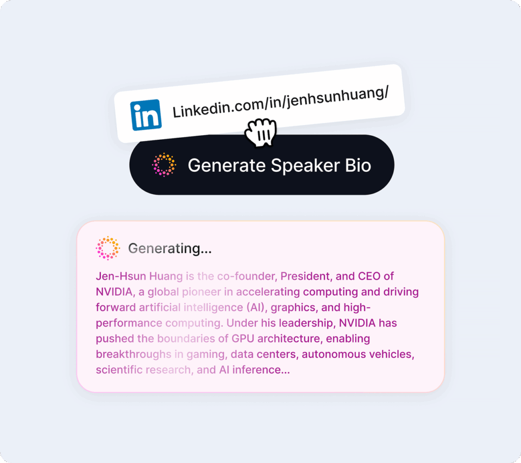 Create in-context, ready-to-publish speaker bios and session & event blurbs in seconds.