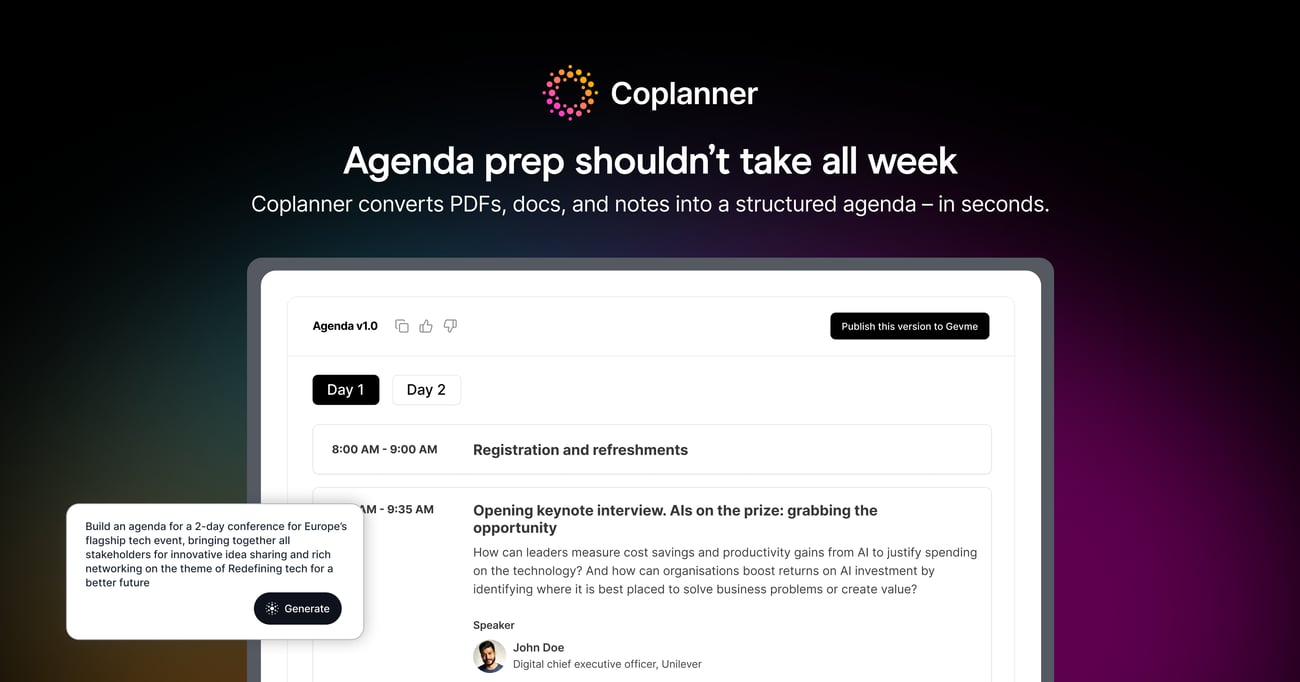 PDF, Word doc, slides, spreadsheets, mixed notes — Coplanner reads the file, interprets the content, and maps everything into a clean agenda inside Gevme.
