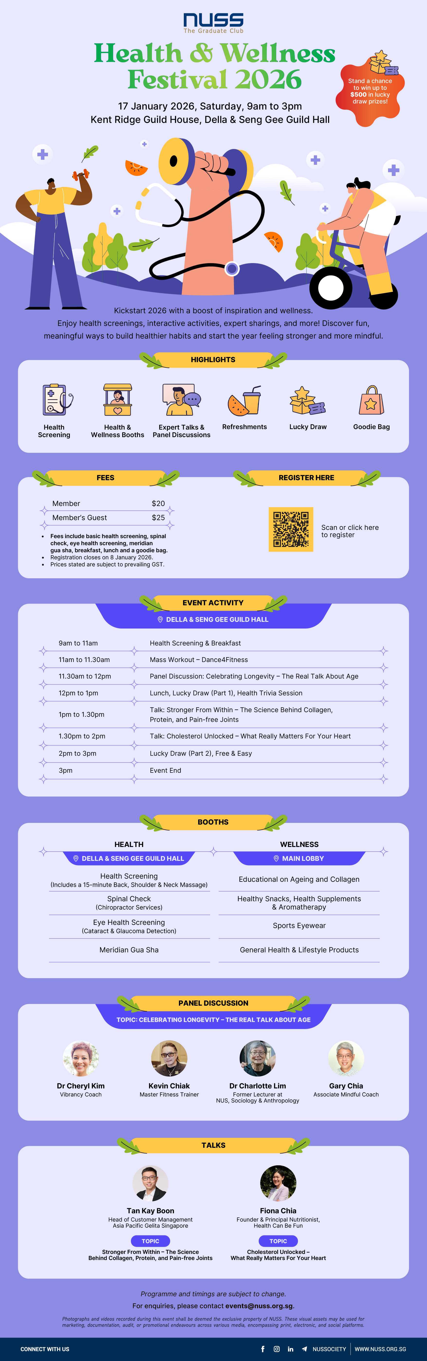 For those who are interested in the health screening, we kindly invite you to click the link below for more details and to register for the complimentary basic health screening at the NUSS Health and Wellness Festival, taking place on 17 January 2026, from 9.00am to 11.00am at Kent Ridge Guild House, Della and Seng Gee Hall. Please note that advance appointment booking is required prior to the event day.