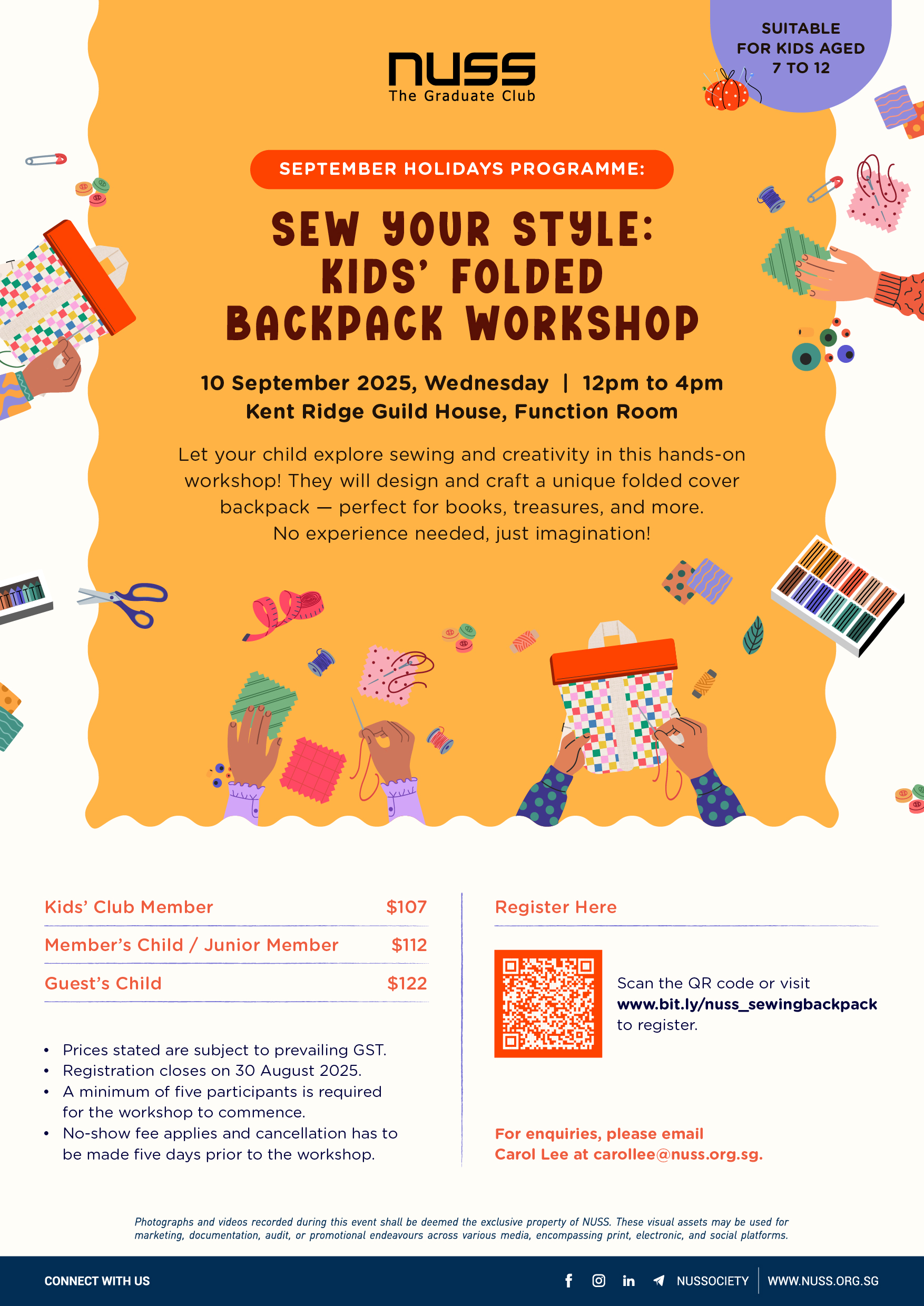 ![[NUSS] SEPTEMBER Holiday - Sew Your Style: Kids’ Folded Backpack Workshop]( https://www.gevme.com/file/location/files/67b5c77e9ba99cf01ddb96252c72ed0a/NUSS_Logo_GEVME_168x133px.png)